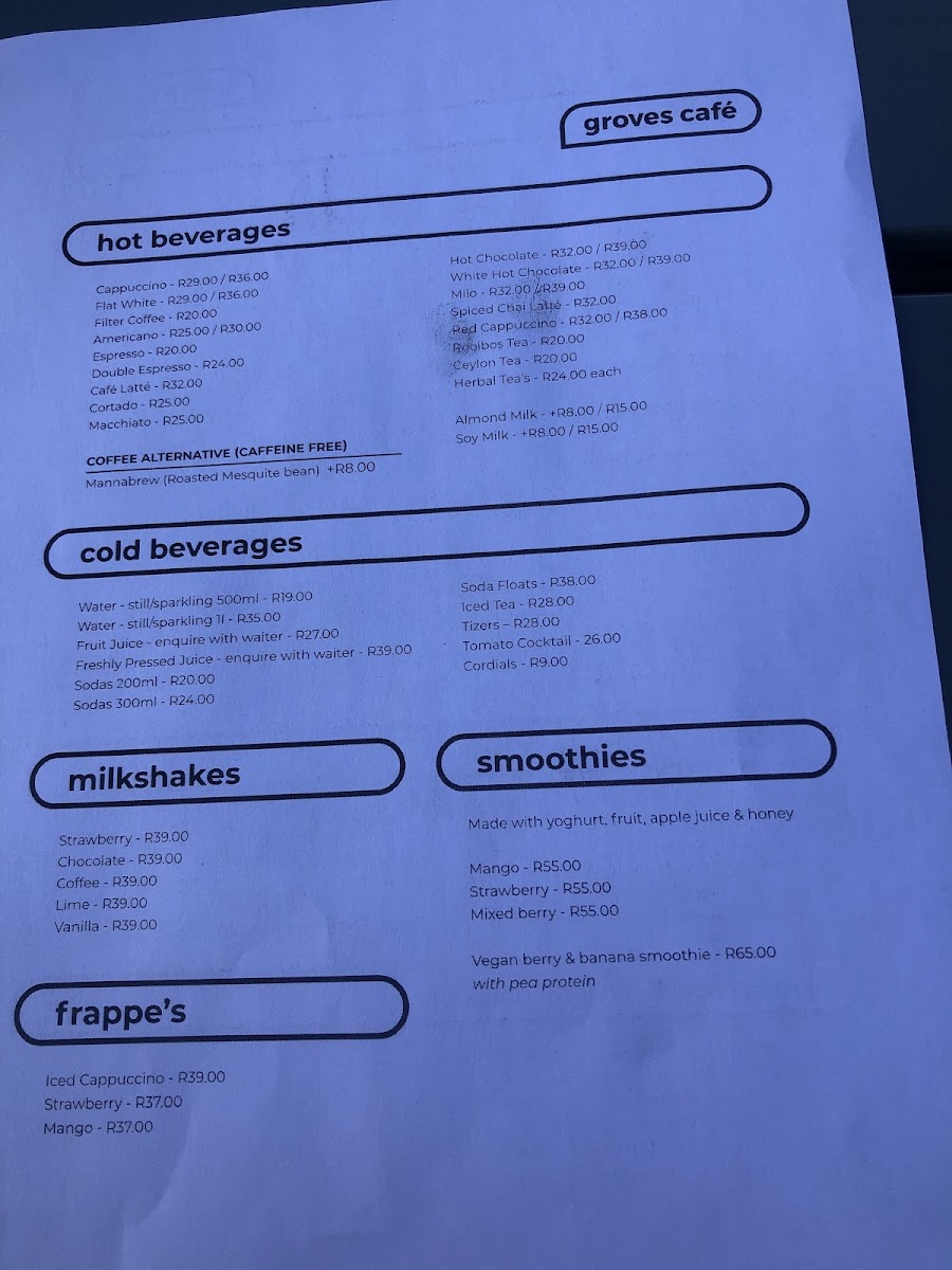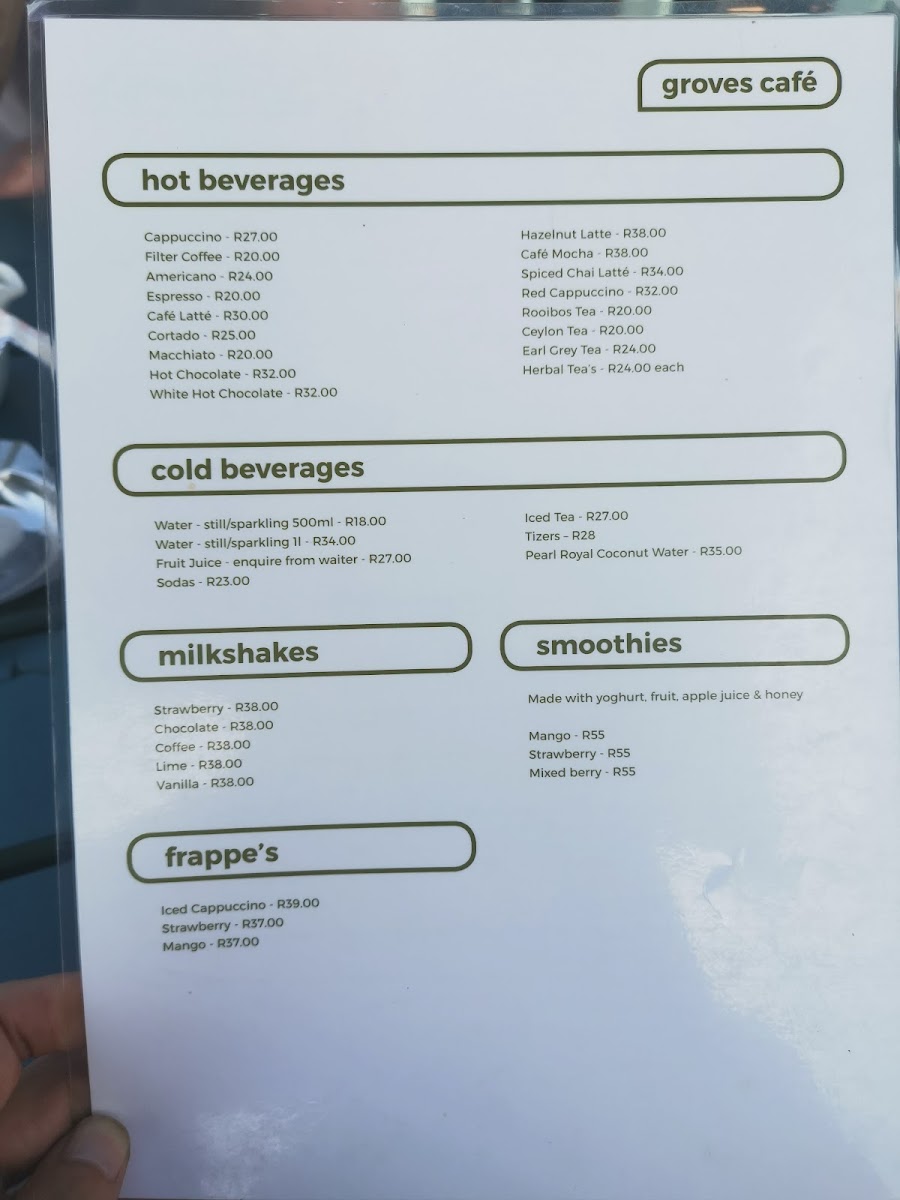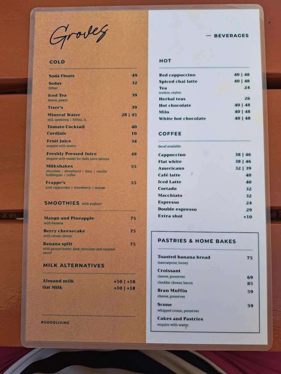 The menu at Groves Cafe offers a variety of options suitable for breakfast, coffee breaks, and light meals throughout the day. It features a diverse selection of coffee and other hot beverages alongside a range of food items designed to cater to different preferences.